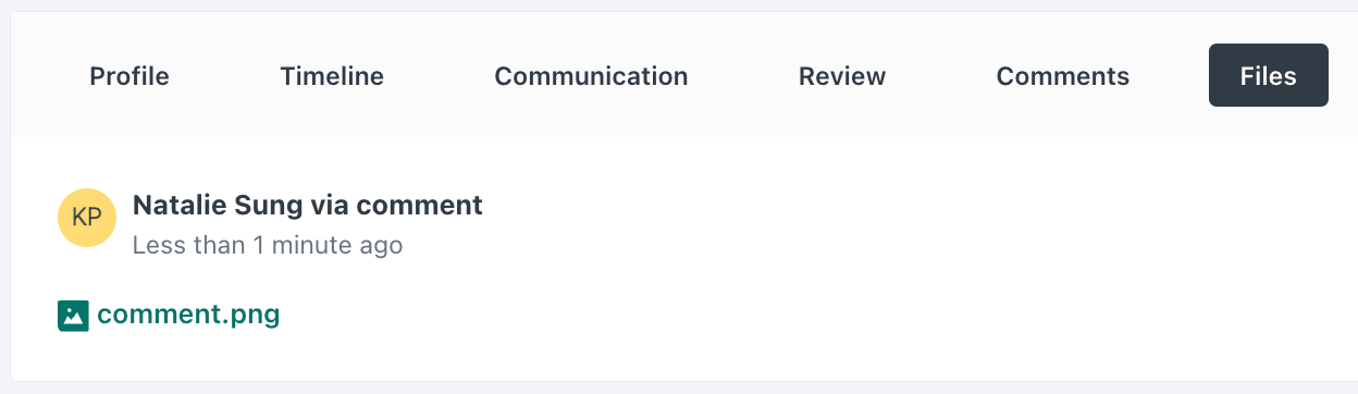 You can attach a file to a comment by clicking Upload file below the comment box. When a file has been attached and the comment is submitted, a Files tab will appear on the candidate's profile to easily access all attached files for this candidate.