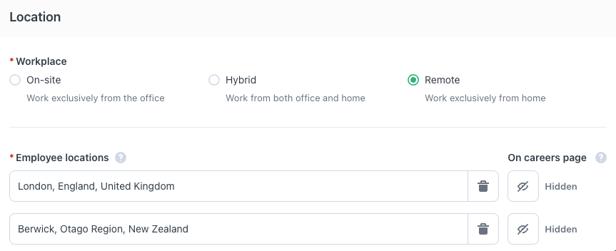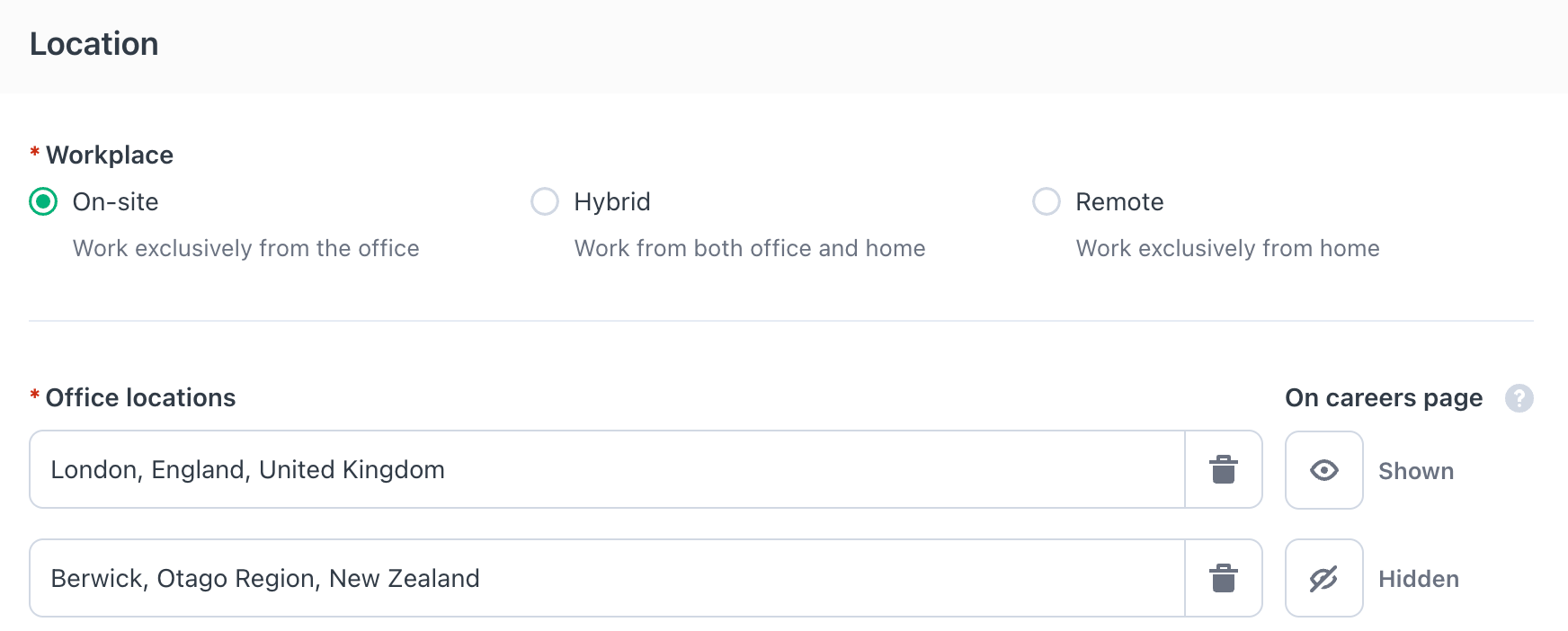 The eye button enables you to select which locations will appear on your Careers page, Referrals portal, or job widget. Note that a minimum of one visible (or shown) location is mandatory for the on-site workplace. On job boards, the posting will be displayed with the location you specified.