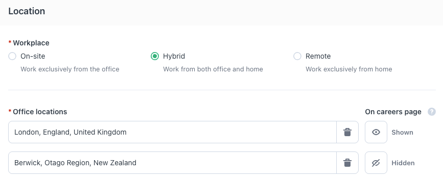 The eye button enables you to select which locations will appear on your Careers page, Referrals portal, or job widget. Note that a minimum of one visible (or shown) location is mandatory for the hybrid workplace. On job boards, the posting will be displayed with the location you specified.
