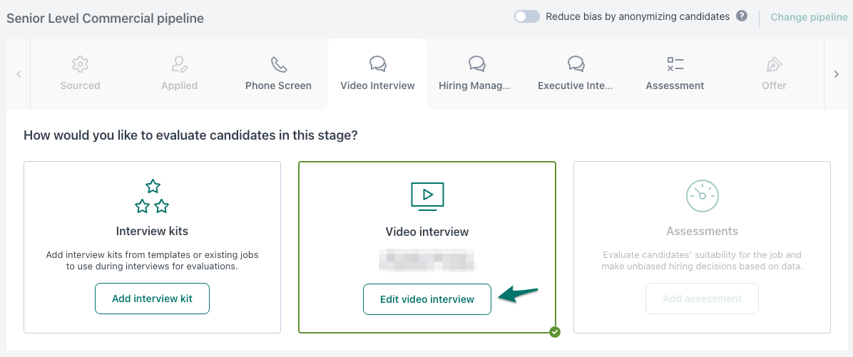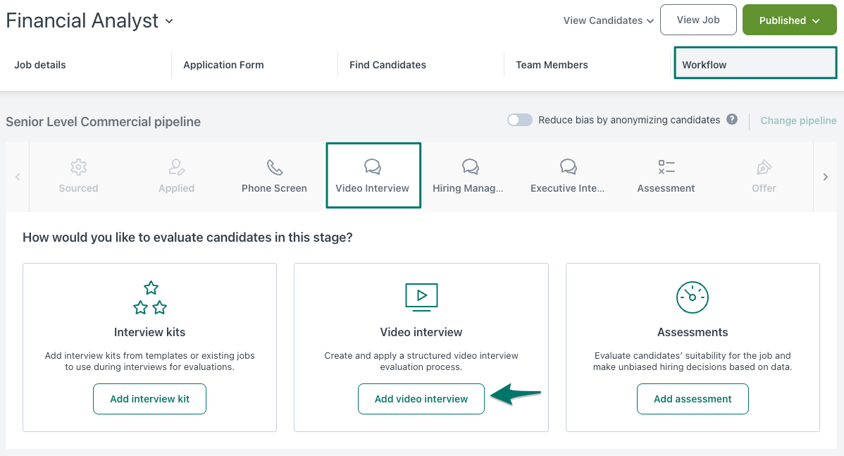 - Select the stage of the pipeline where you would like to add the video interview. The available stages to choose from are ‘assessment’ types, for example, Phone Screen, Assessment and Interview and they appear on the top of the Workflow section.