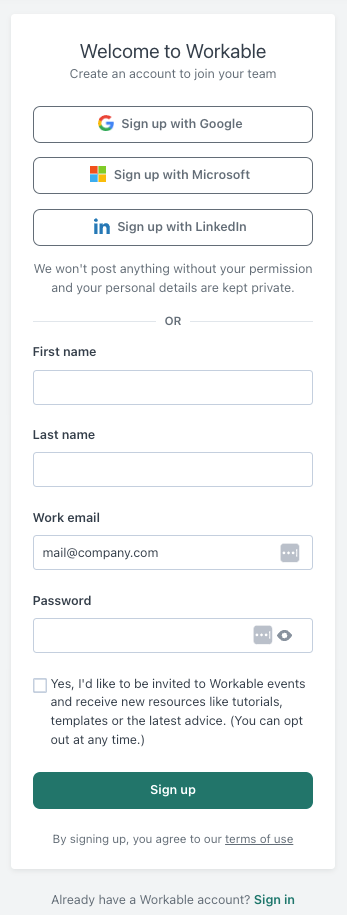 Before logging into your account, a Workable Admin member will probably trigger an invitation email that grants you access to Workable. Follow these steps to sign up for the first time: