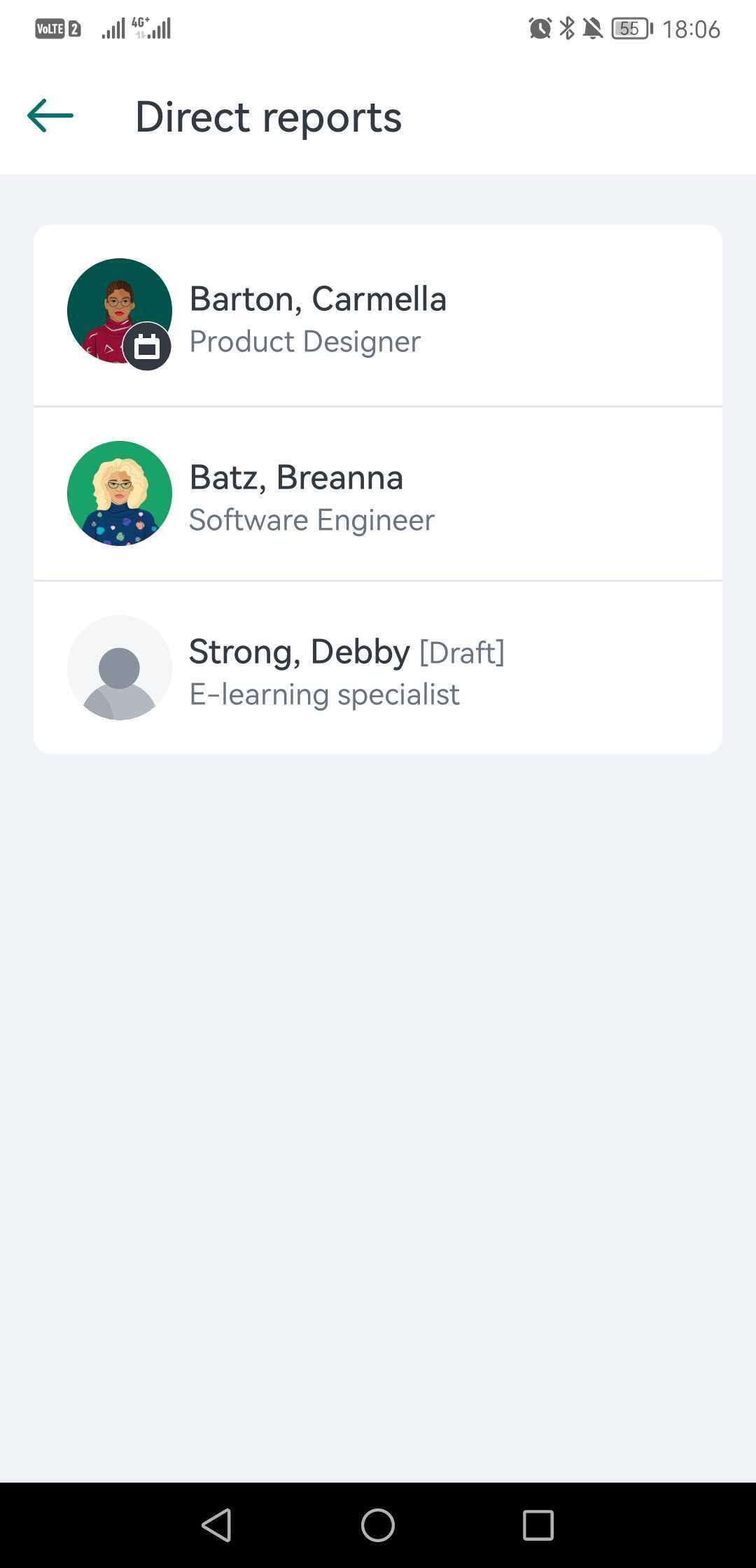 Direct reports Get an overview of your direct reports (if any) and quickly view who is out of office (calendar icon in their avatar). Your team Get an overview of your team; manager and teammates (if any). To-dos Get an overview of your pending tasks like time-off request reviews or profile update reviews from employees. Today Get an overview of all celebrations, holidays, or employees on leave today. Your time off Check your time off balances and upcoming absences or request time off.
