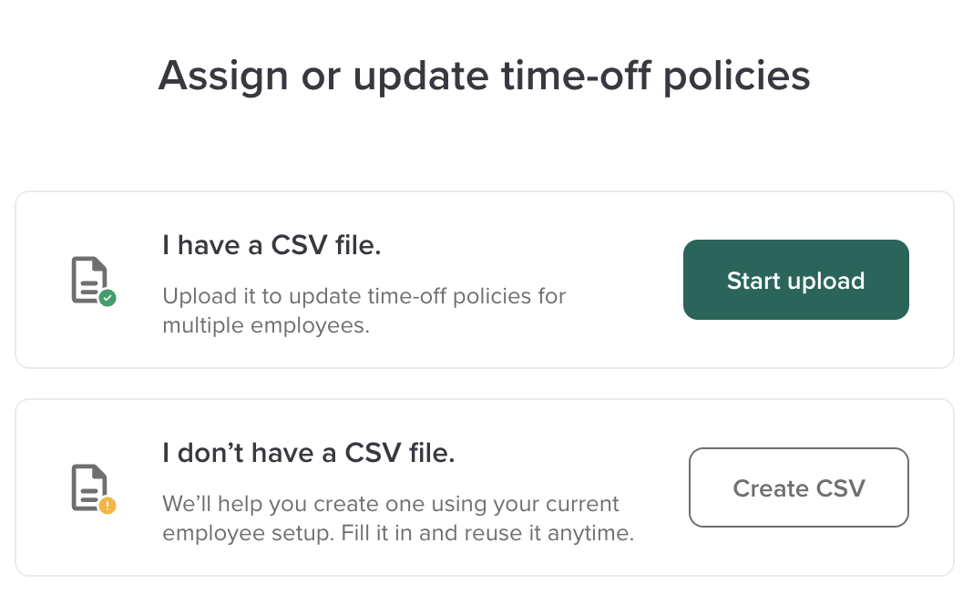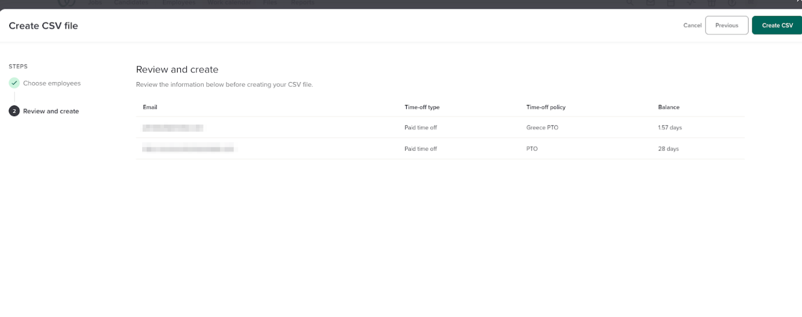 HR admins can update employee time off policies and balances in bulk by uploading a CSV file. To create a CSV file: