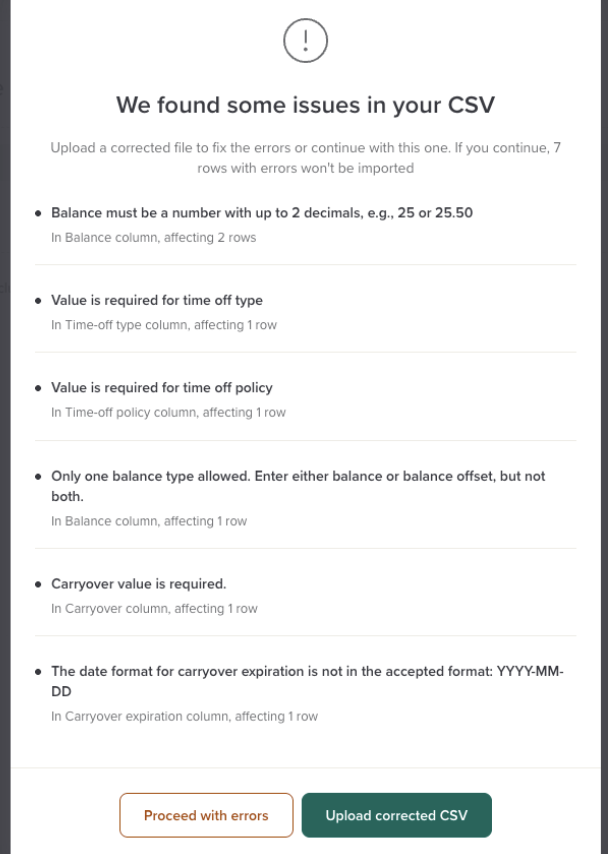 | Conflicting policies are provided for <time off type> | The employee has multiple entries with different policies for the same type; remove or correct one entry |