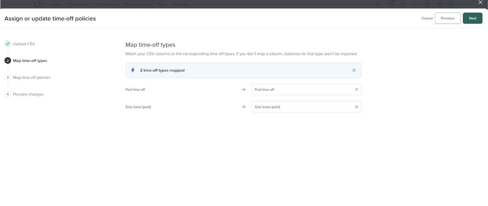 If the same names of time-off types have been used in the past, Workable will automatically pre-fill the mapping and inform the user with the blue banner shown above.