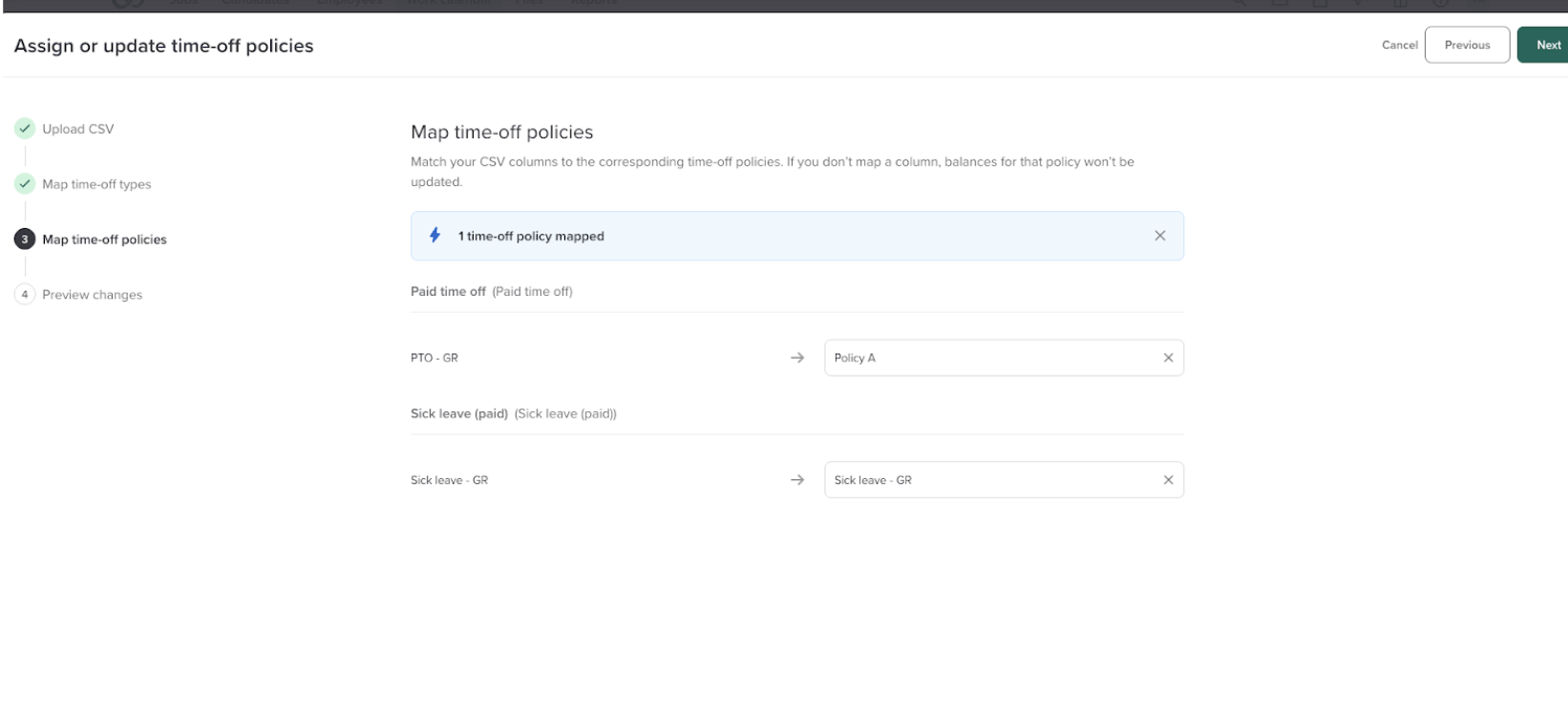 As in the previous step, you must map at least one time-off policy of the CSV file to a Workable one to start the import process.