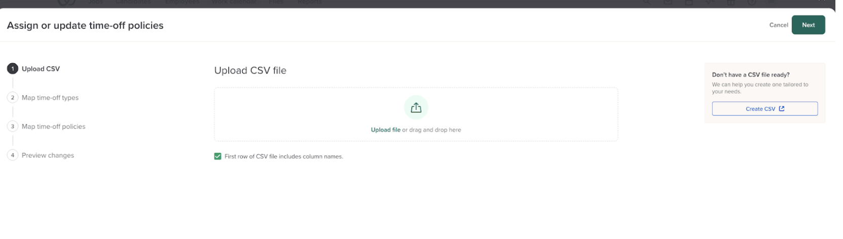 Multiple values from the CSV file can be mapped to the same time-off policy of Workable, enabling you to simplify or clean up your data during the transition from another application.