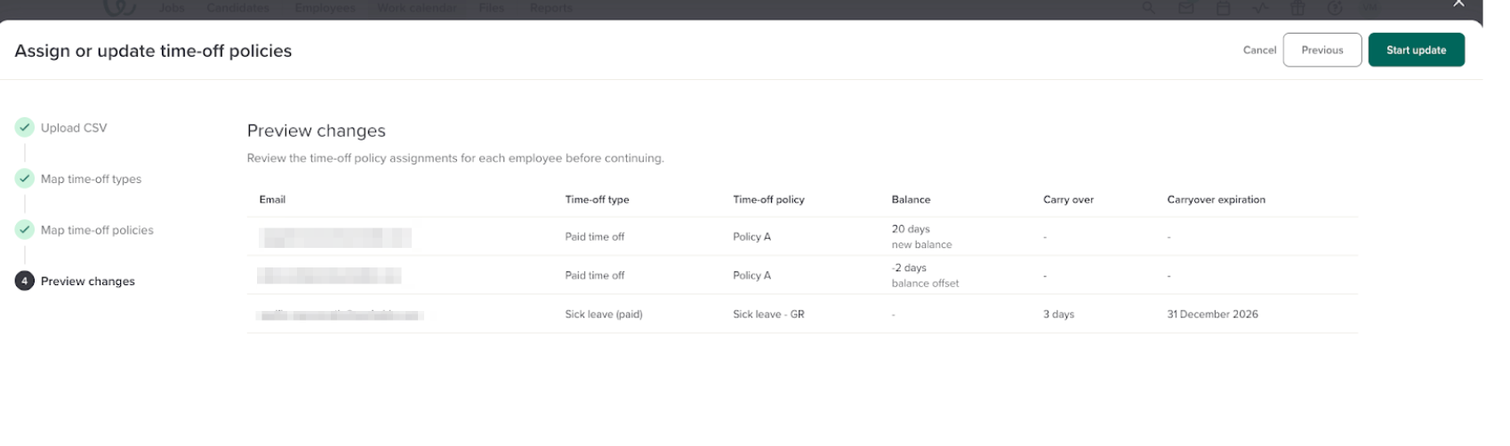 - If an employee has already assigned a time-off type and a policy for this type, then the balance will be updated if there is an exact match between the CSV file and the assignment that is in place in Workable.