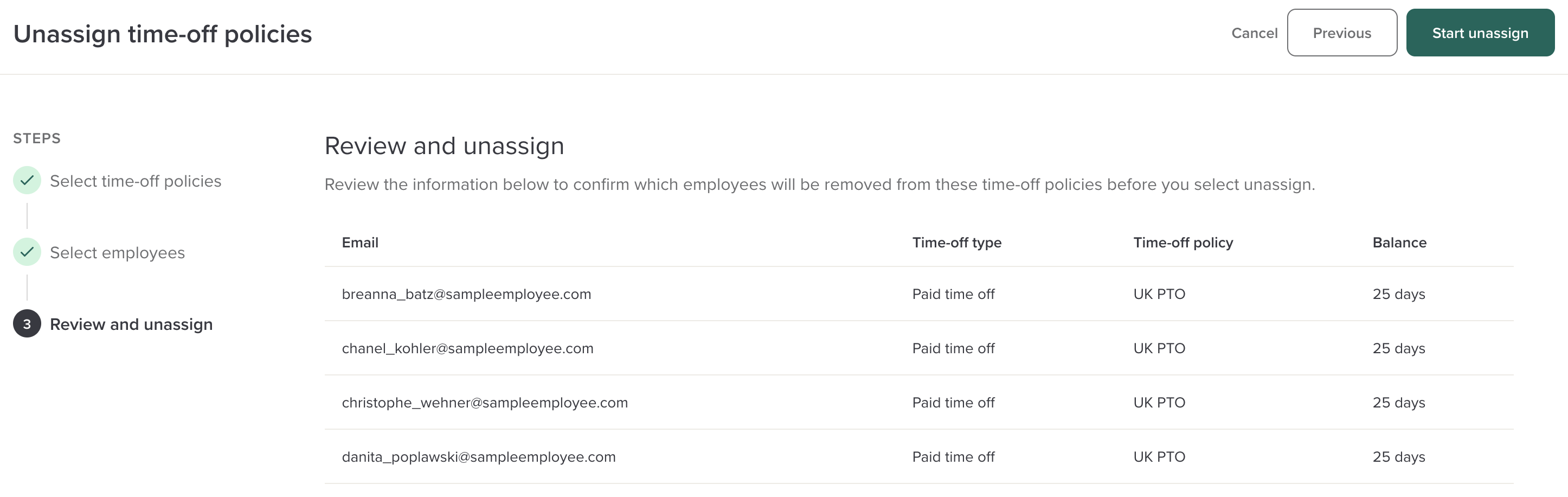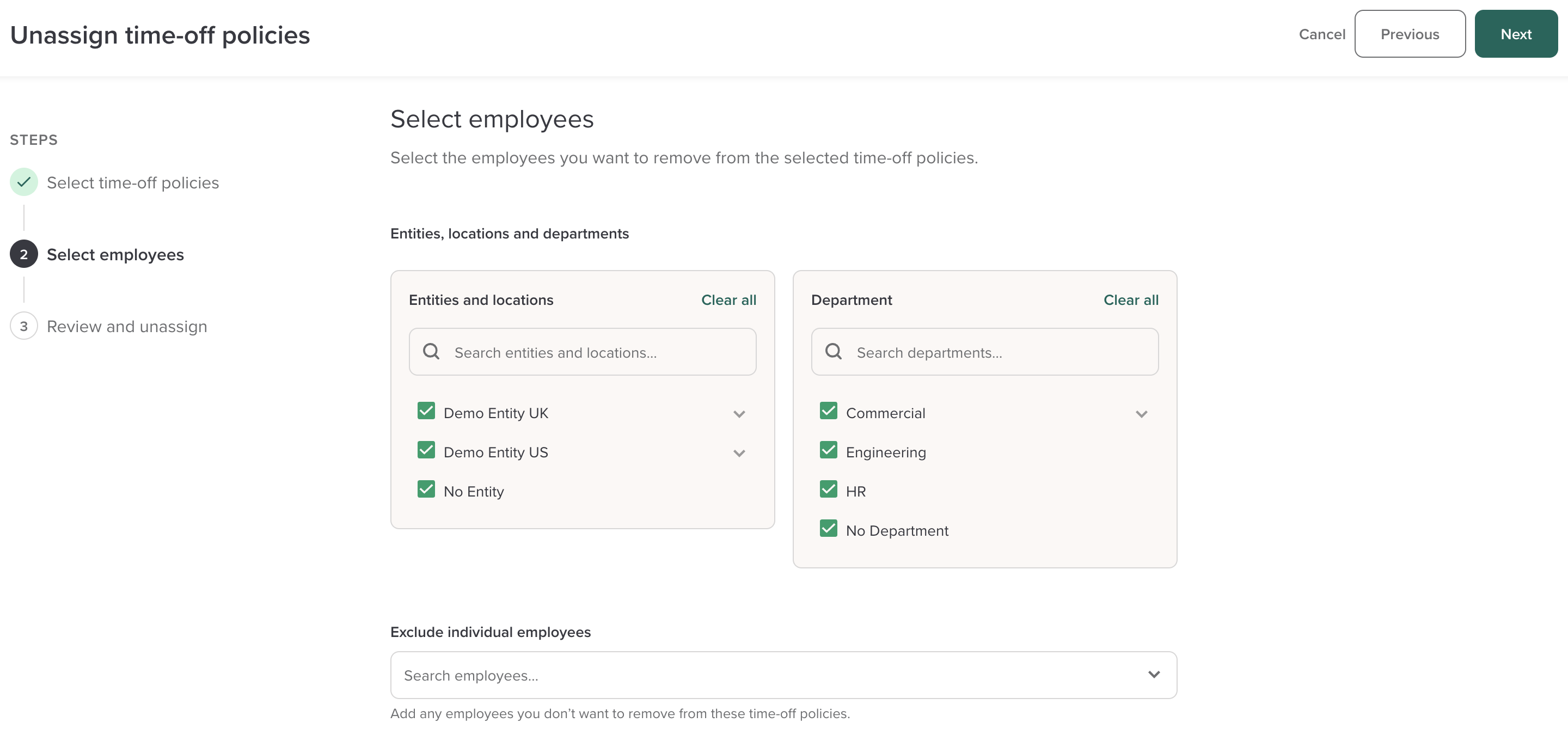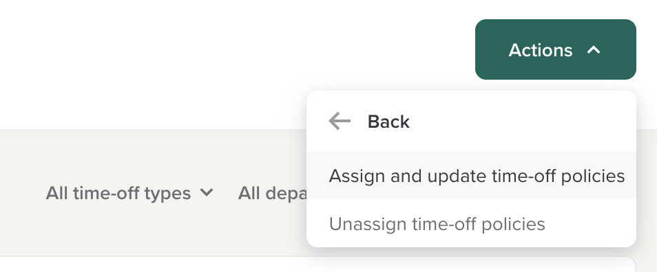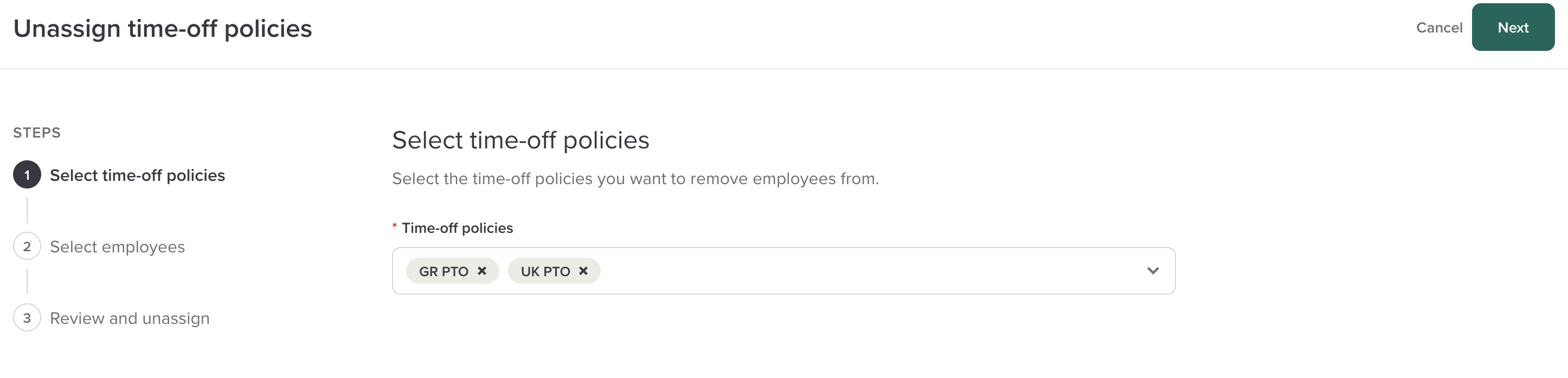HR admins can also remove time- off policy assignments from employees in bulk. This is useful when policies were assigned incorrectly or when restructuring time-off policies. To get started: