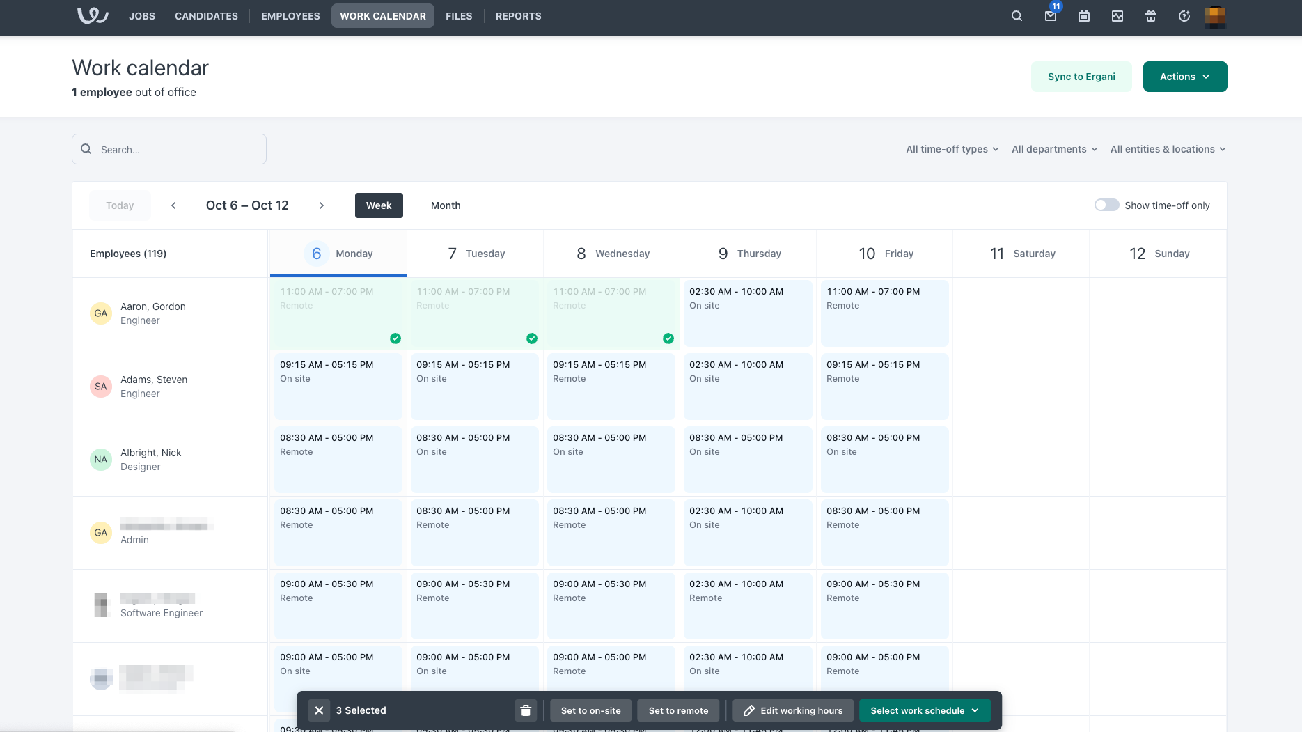 Via the Work calendar you can make quick one-off adjustments (for example, editing a day’s hours or marking a day as remote) or apply schedule updates in bulk to multiple days or employees.