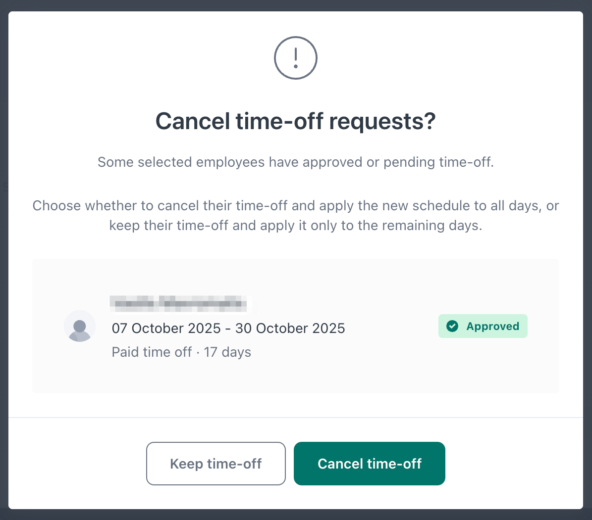 If the selected days overlap approved or pending time-off requests, you’ll be asked whether to cancel time off (apply schedule changes) or keep time off (not recommended, as it may cause balance mismatches).