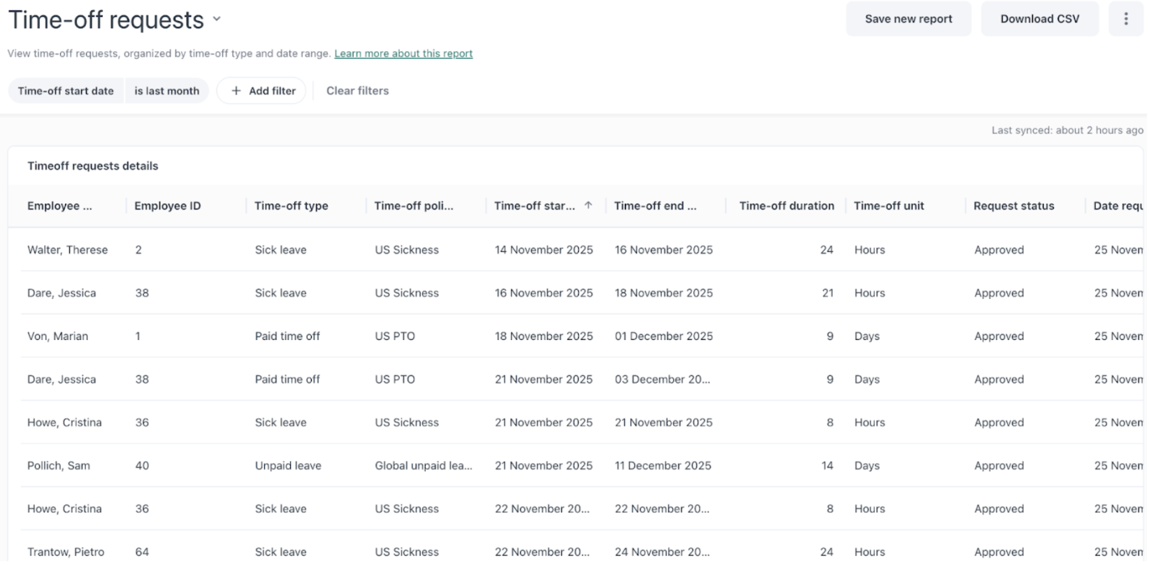 Data filter: Includes data based on the start date of time-off requests