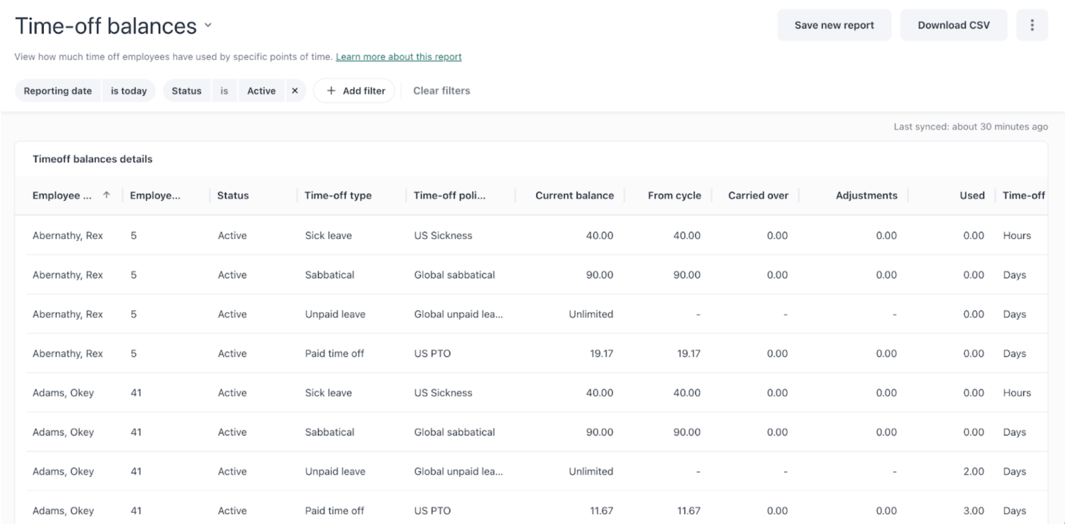 Key info: Overview of each employee's time-off balance, including the days they've carried over, used or still have available