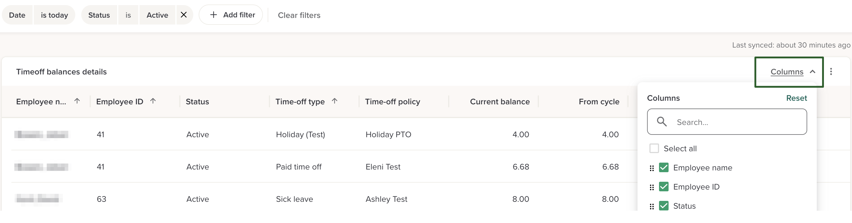 - Current balance (amount): the total balance the employee has (had) for the specific time-off type, policy, and date selected, including carried-over amounts from the previous cycle