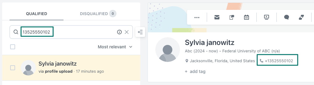 Profile matches will be generated for both exact and partial matches. Phone number searches can also be combined with other search terms, such as a candidate's name.