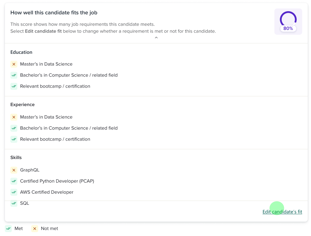 You can always override AI decisions by using the “Edit candidate's fit” functionality at the bottom-right of the AI module (only users with profile edit permissions can edit AI matches).