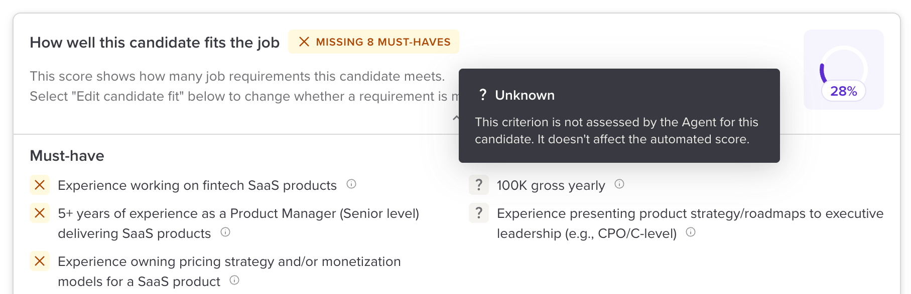 The AI Screening Assistant is used to evaluate candidates. It can assess only a subset of the defined matching criteria, so some criteria may appear as Unknown in the candidate profile. These will include a note indicating that full evaluation requires the add-on and they don't affect the automated score.
