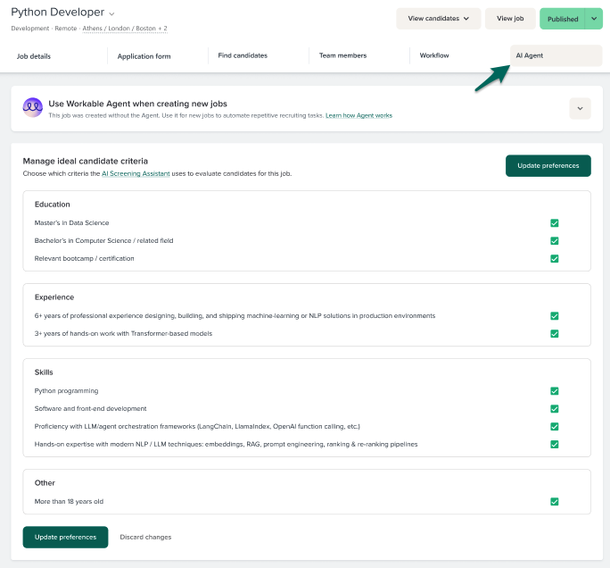 When you create an agentic job, candidate evaluation depends on whether you have purchased the Workable Agent add-on.