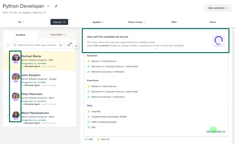 The matching degrees represent the percentage of criteria that have been met. The score on the candidate avatar under the candidate list appears only on the All, Sourced, and Applied stages.