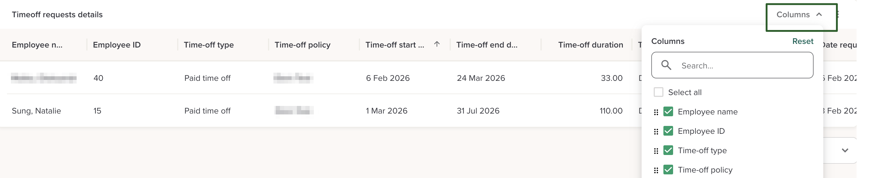 You can customize which columns are visible in the report and their order. Select the column picker to add, remove, or reorder columns. Resetting the columns returns them to the default state.