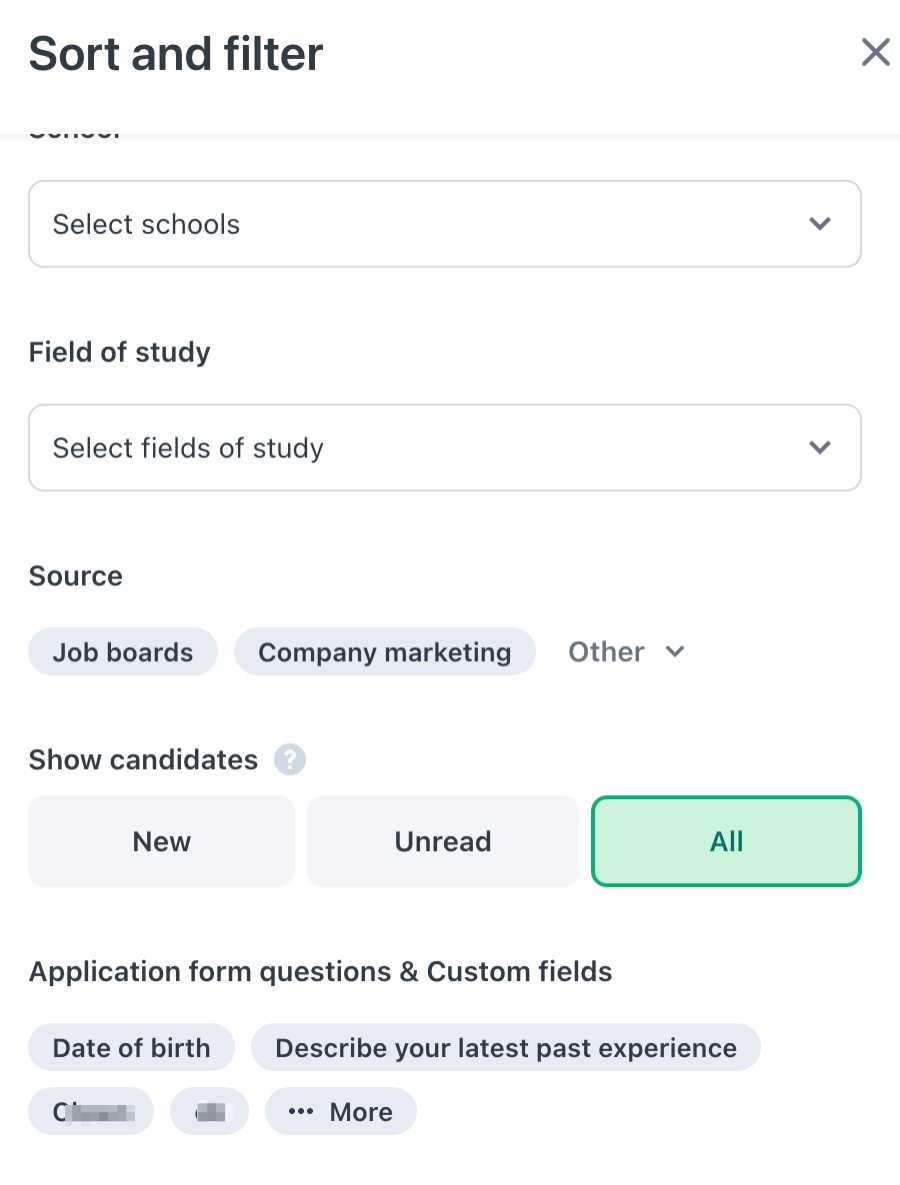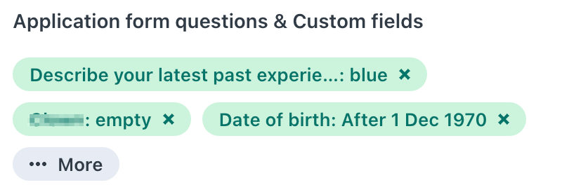 - The filter by application form questions and candidate responses is merged with the custom fields filter and is only available on the pipeline view, as job context is required.