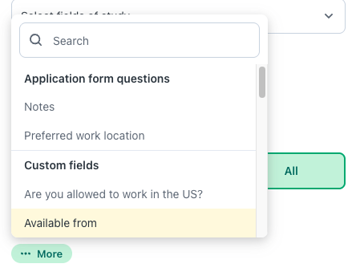 - Select one or more from the four indicative custom fields / application questions that will be suggested, or click More to view the list of all enabled fields/questions.