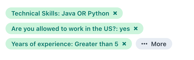 Depending on the type of custom field or application question you select, you'll be presented with the proper filter options. Filters can be inclusive or exclusive.