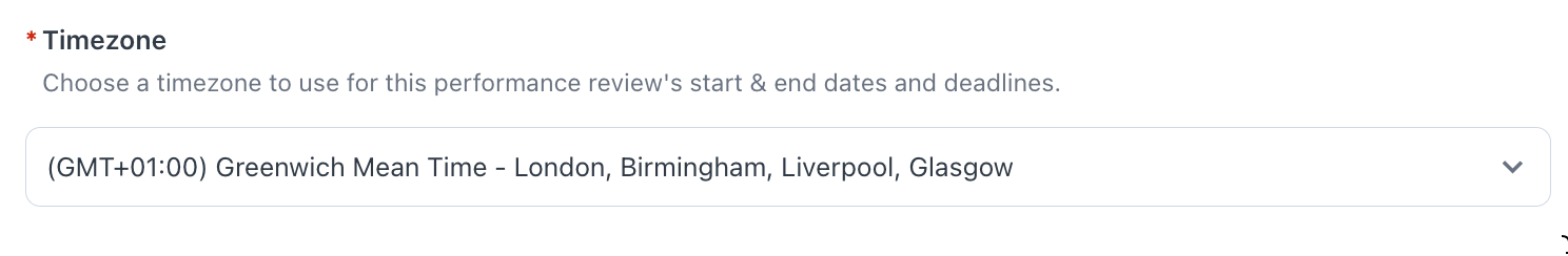 Choose the timezone that will apply to the review cycle’s start and end dates, as well as all related deadlines. Everyone will share the same deadlines, but each employee will see them automatically adjusted to their own timezone, based on what’s set in their profile.
