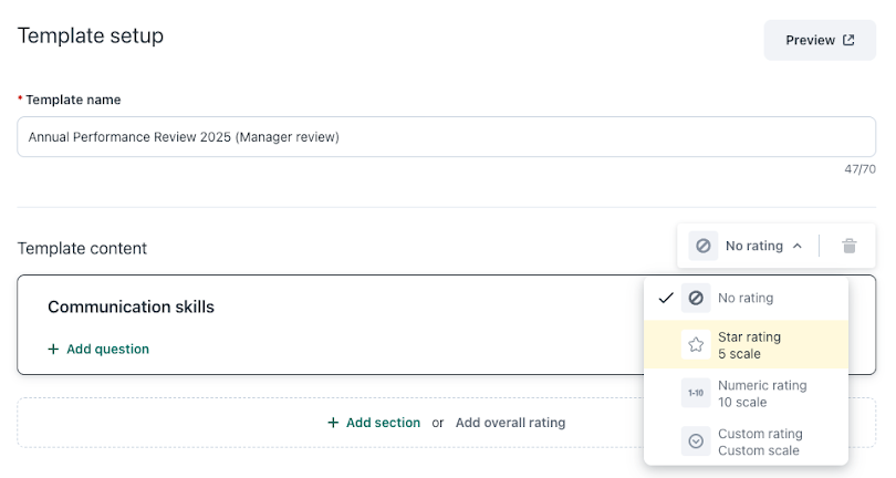 - Yes! Once you add your sections and questions, you can configure whether you need a rating for them and which particular rating format to use.