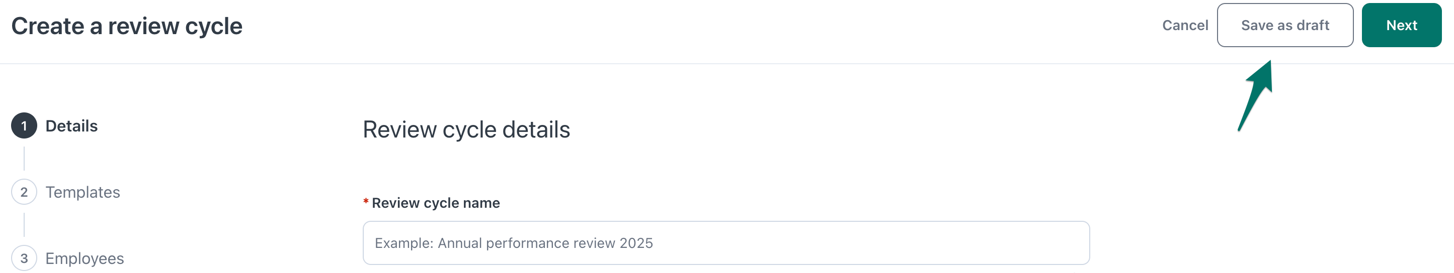 - Review cycle name: This name will be shown to employees when asked to complete their reviews.
