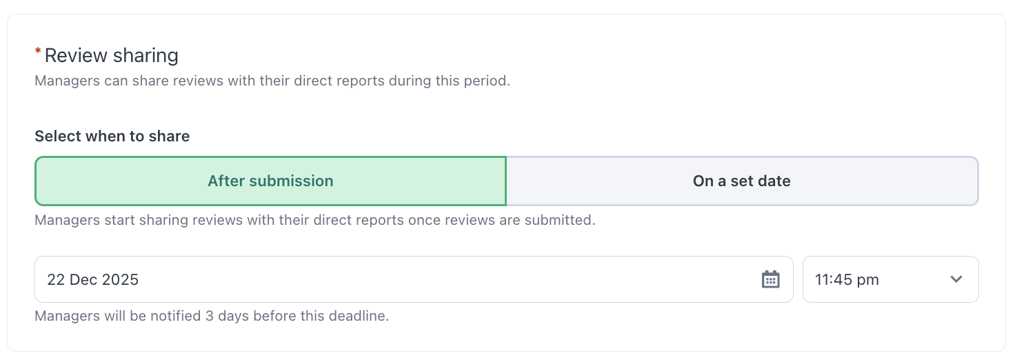 The sharing period can be set up to be "after the submission" or "on a set day". Once the sharing period starts, the system will automatically notify all managers, prompting them to start sharing reviews with their teams.