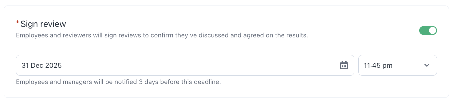 If this setting is enabled, employees and reviewers will be asked to sign reviews after they've been shared to confirm they've discussed and agreed on the results. Employees and managers will receive a reminder 3 days before this deadline.