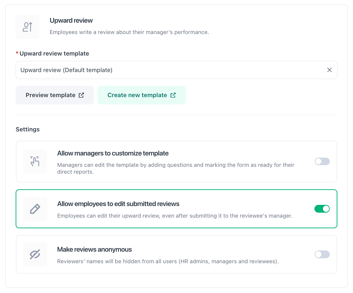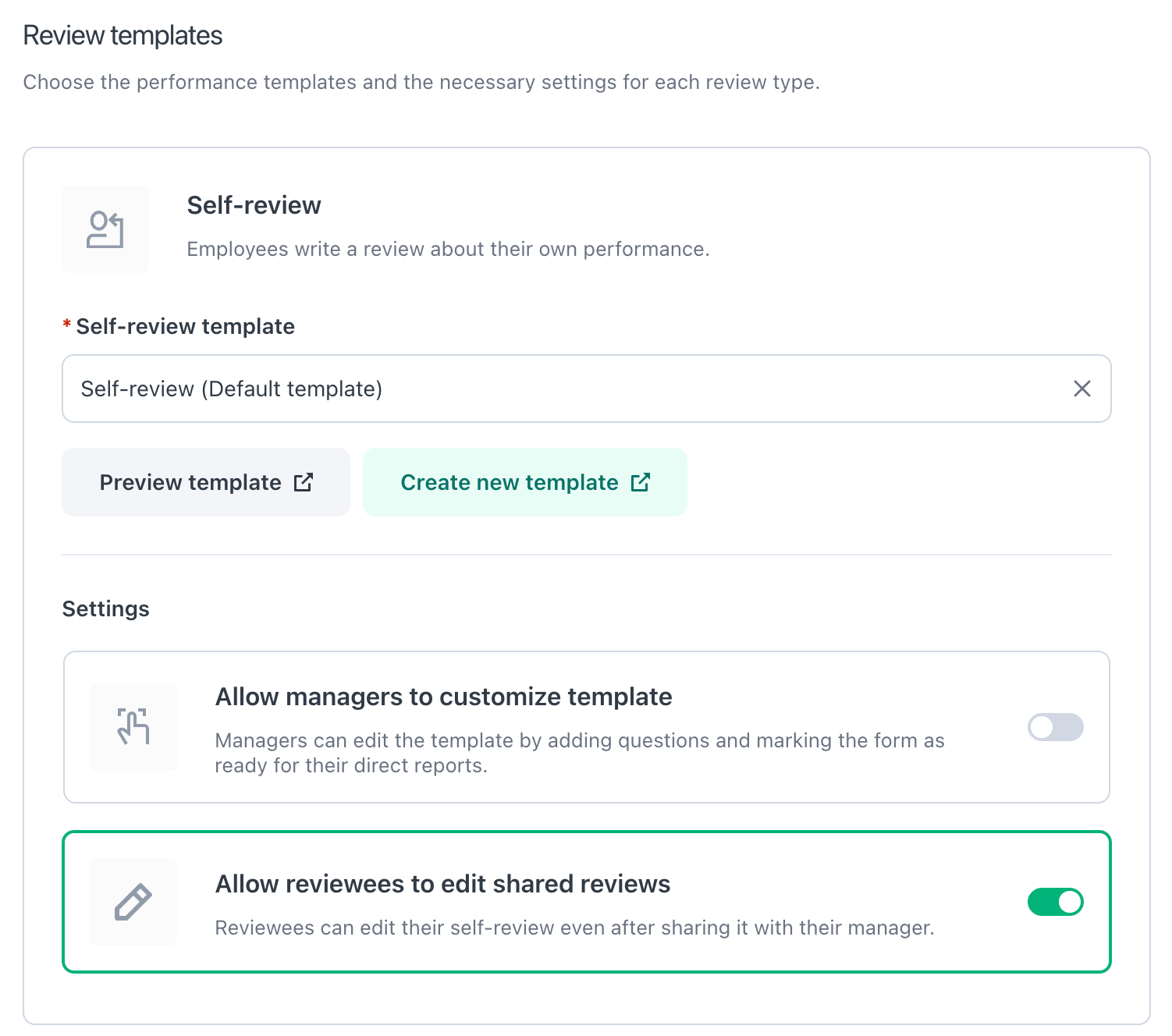 This option will appear only if you allow managers to customize self-review and/or manager review templates in step 2.