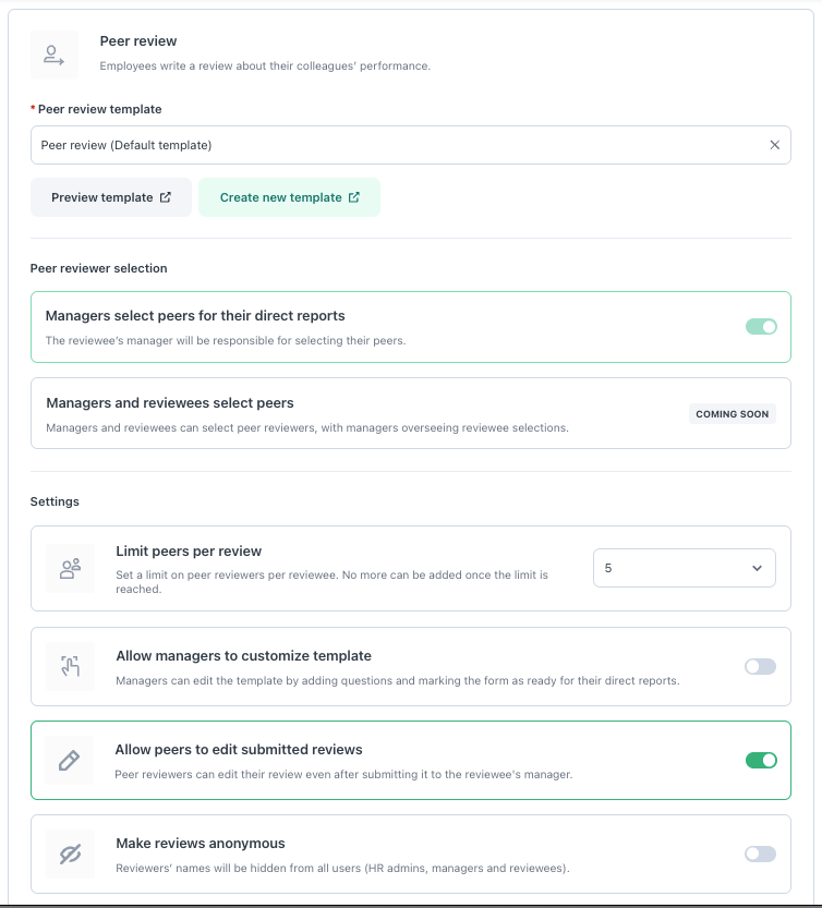 For each review type, select the template you would like to use. You can also configure the settings below separately for each review type.