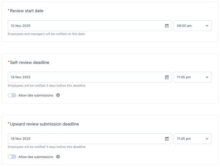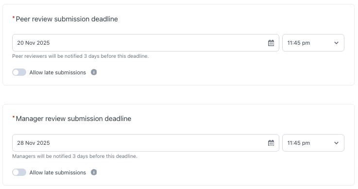 Note: Allowing late submissions gives employees extra time to complete their reviews, accommodating unexpected delays (e.g., scheduling conflicts, workload demands). This option is not displayed to employees, enabling them to stick to original deadlines and maintain consistency in the review timeline, thus preventing potential delays.