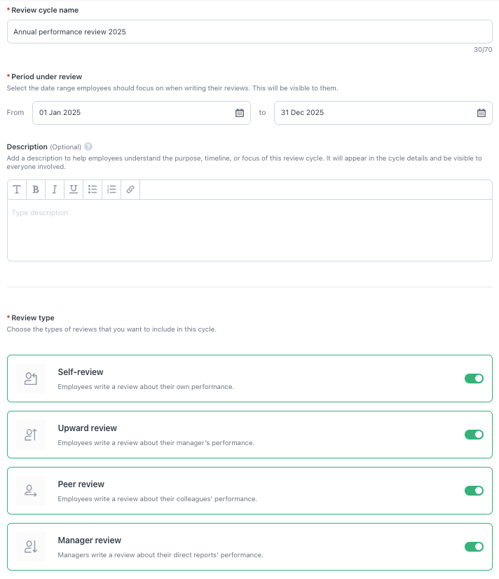 - Description (coming soon): Add a description to help employees understand the purpose, timeline, or focus of this review cycle. It will appear in the cycle details and be visible to everyone involved.