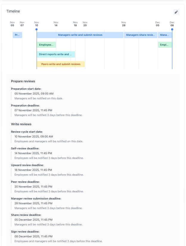 Choose the timelines for when your employees should prepare, write, submit, share, and sign their reviews based on the review types you have selected.