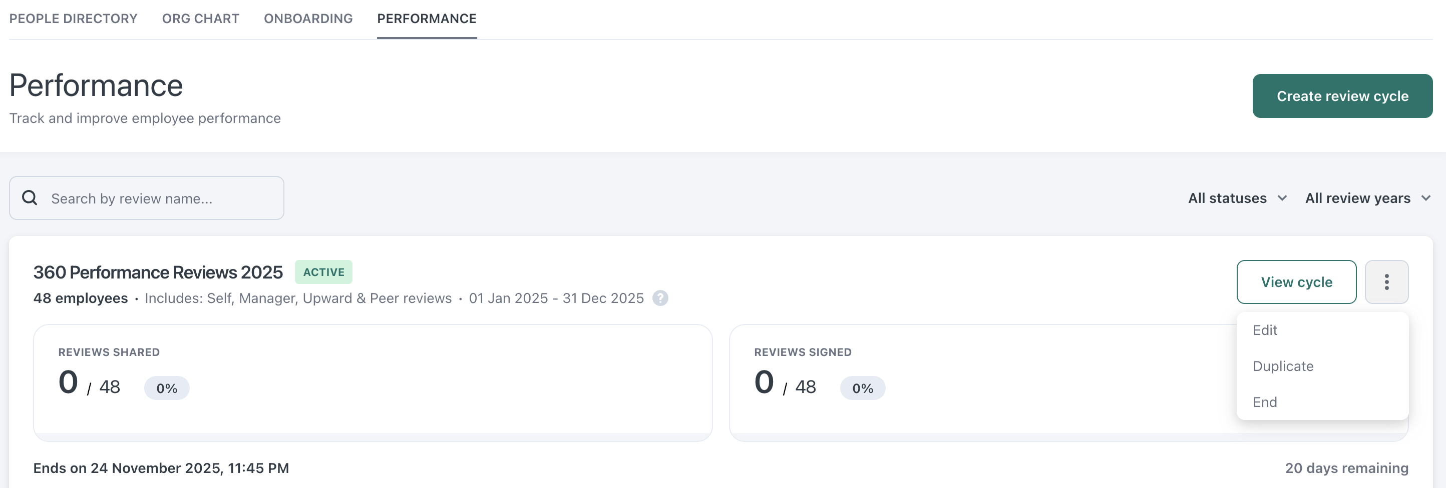 Once a review cycle is created, it will appear as scheduled until the review start date. HR Admins have full control over performance review cycles, and they can view, edit, start, end, duplicate, archive, or delete them as needed (under the three dots menu ).