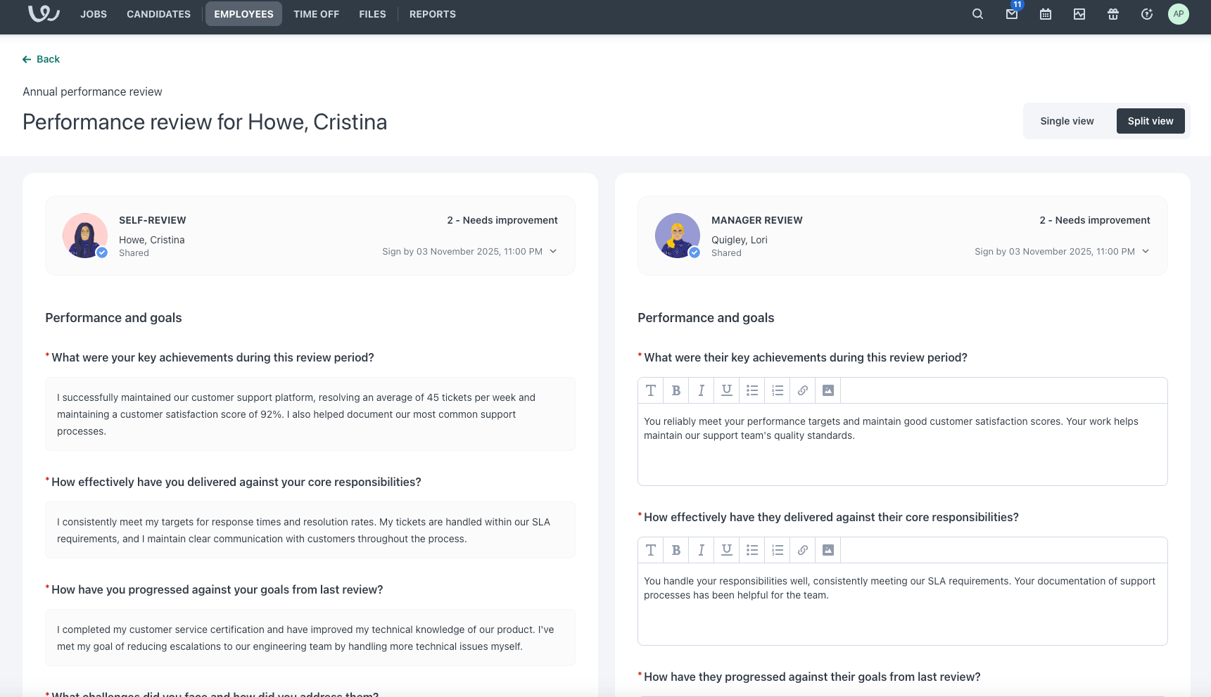 - If your direct report has already shared their review, you can view them side by side while writing yours.