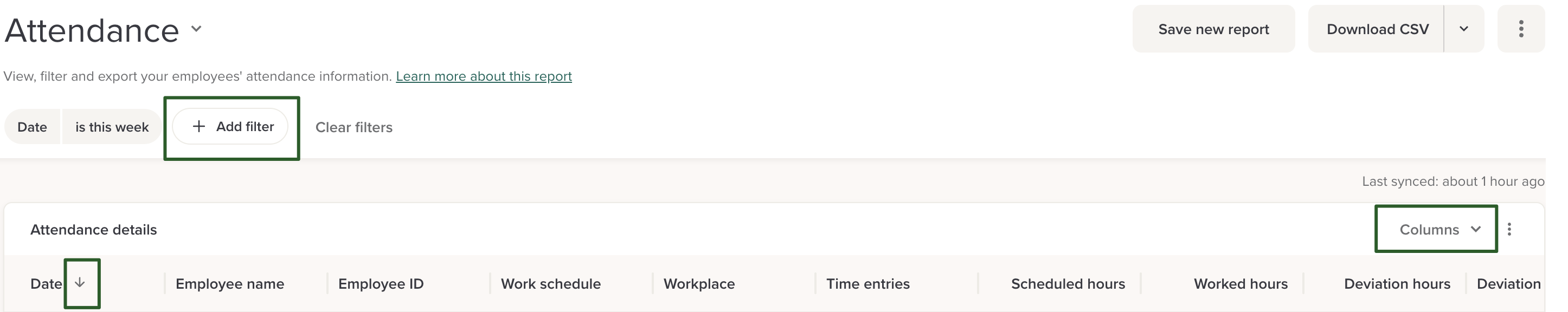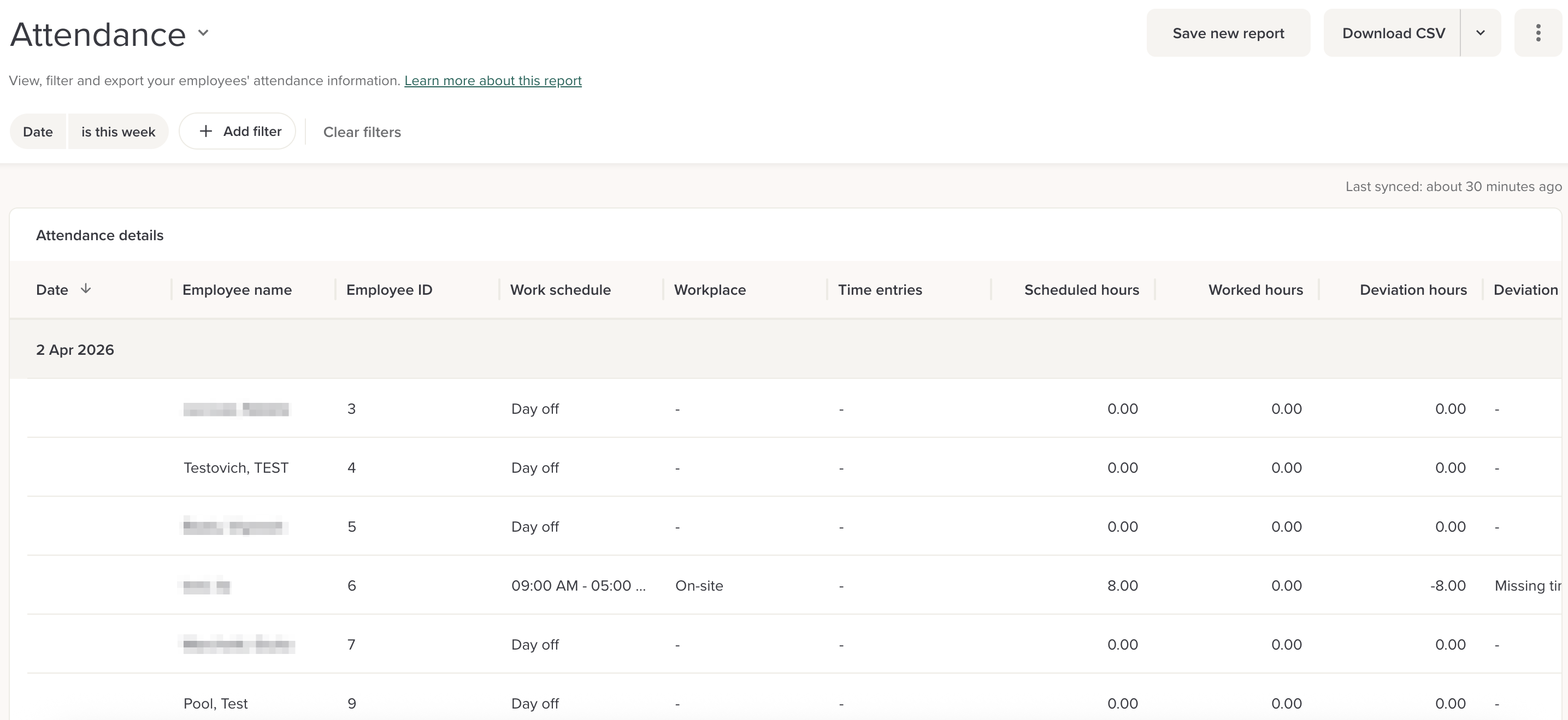 Known issue: At this time, all hours columns display as numeric values (e.g., 8.50 instead of 8h30m). This will be fixed in an upcoming update. The numeric format will continue to be used for CSV exports, as it is useful for payroll purposes.