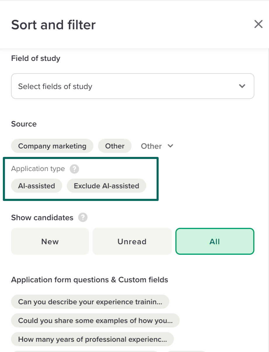 You can filter your candidate list to include or exclude AI-assisted applications. The AI-assisted filter is available in the Pipeline view and the Candidates page.