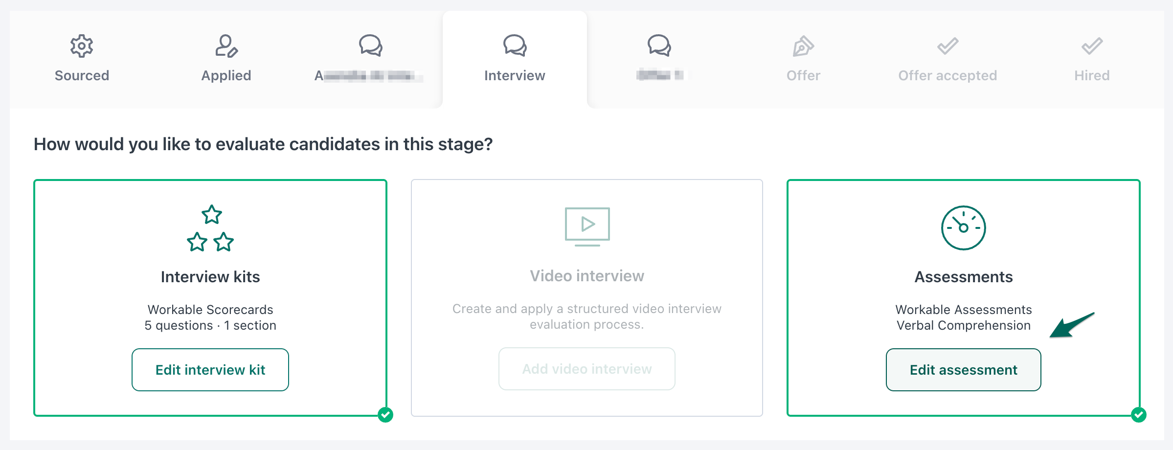 - Select the stage with the assessment and click Edit assessment. In this example, we have set it up under the Interview stage.