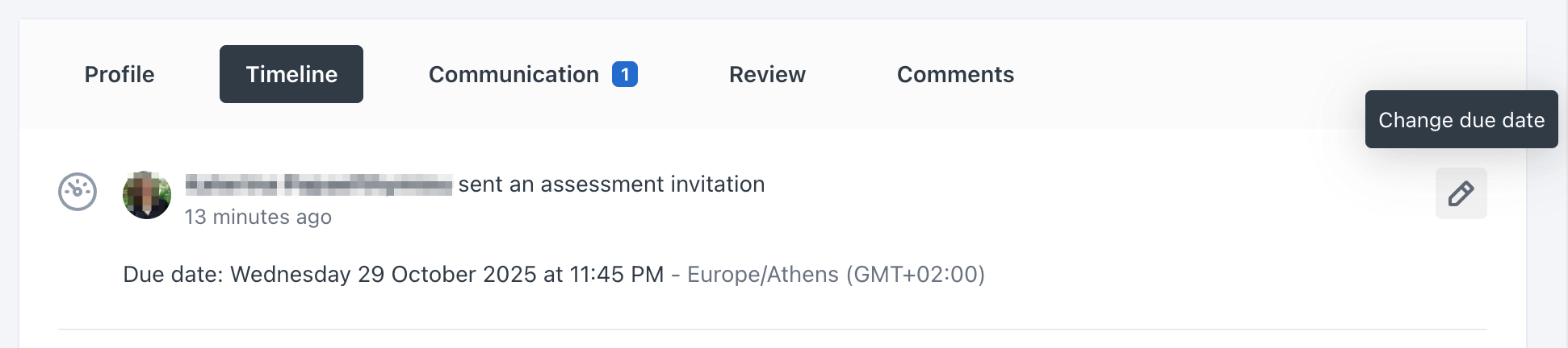 - Click on the pencil icon, make changes, and then click Change due date. The candidate will be notified automatically that the due date has been updated.