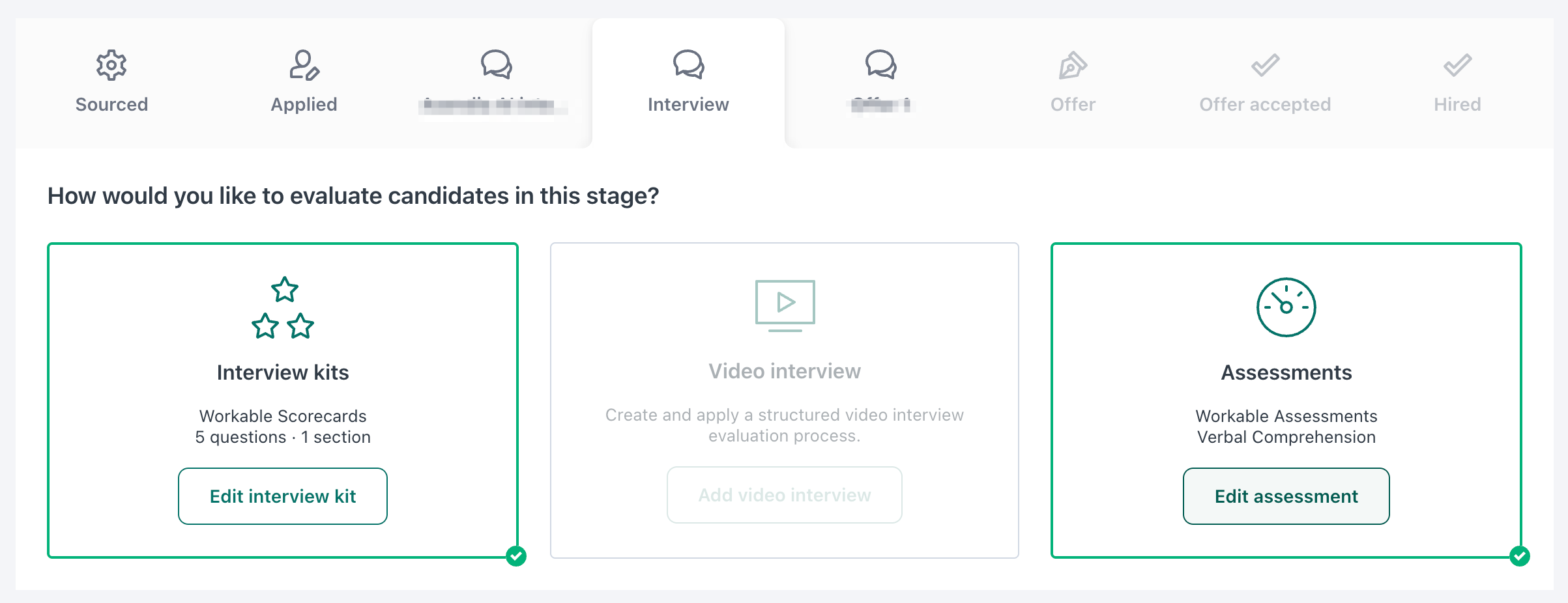 - Select the stage with the assessment and click Edit assessment. In this example, we have set up Workable Assessments under the Interview stage, but editing is also possible for third-party assessment providers.