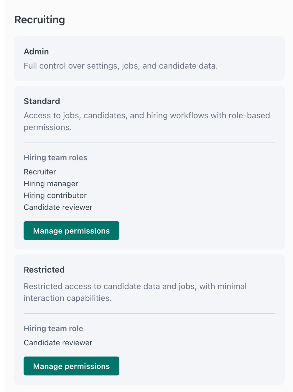 Recruiters are assigned to specific jobs and can only see candidates in those jobs. Within those jobs, they can take all actions that an Admin can.