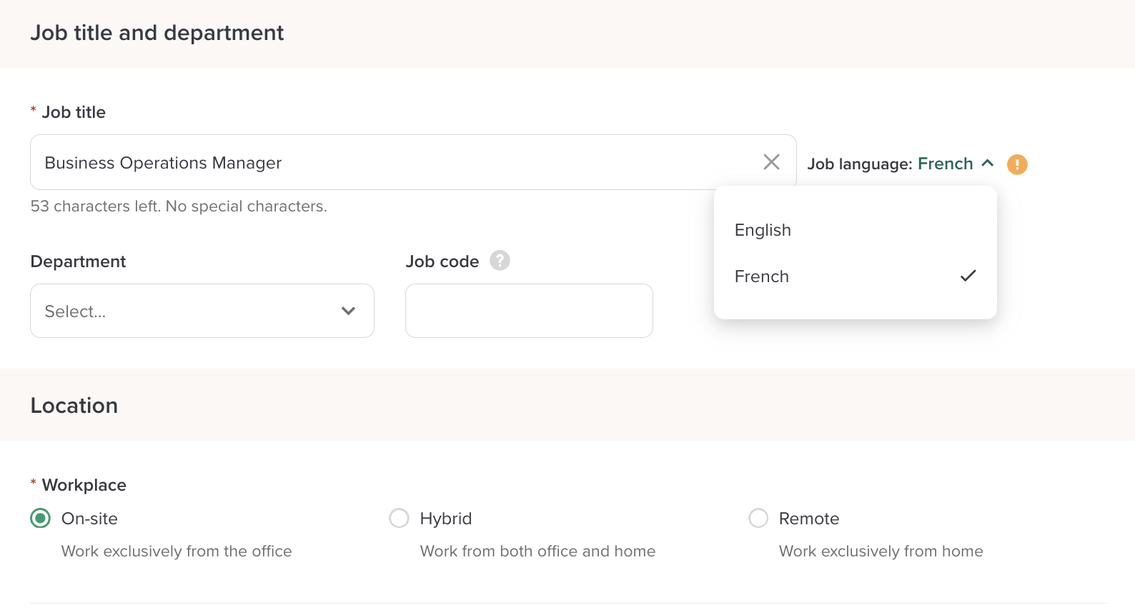 The language that is selected will be the language used for all aspects of the candidate’s experience. Things that you input manually, like job descriptions or emails, should be written by you in the relevant language; pre-written job description templates are available in multiple languages.