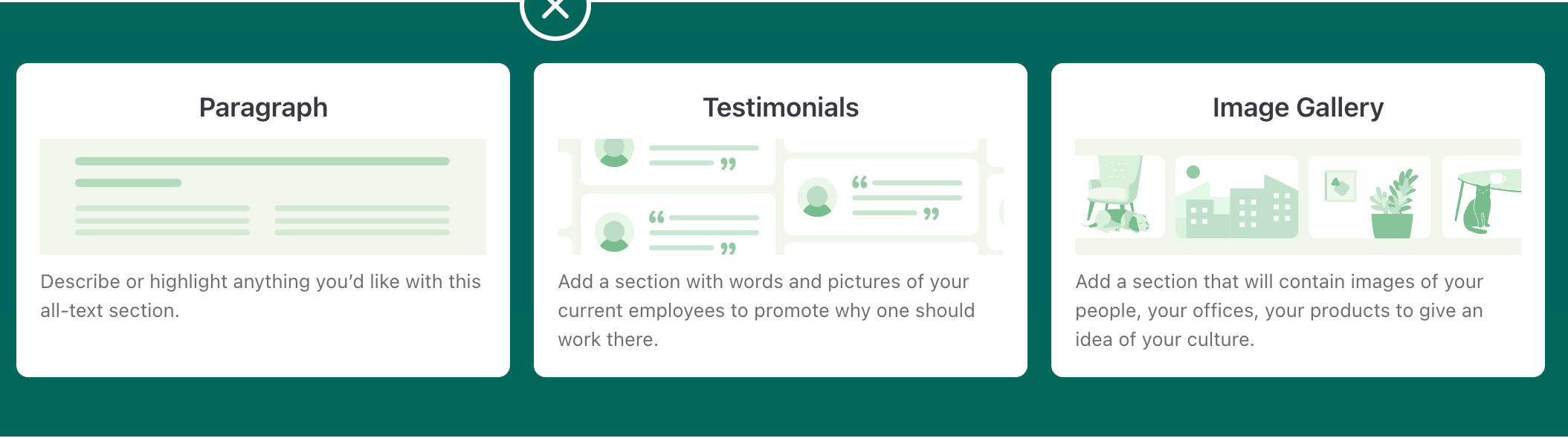 There is a wide variety of section types to choose from. Add modular sections to showcase images, display office locations on a map, share employee testimonials, and more. Use these sections to give candidates a sense of what it is like to work at your company and to address common questions prospective applicants may have.