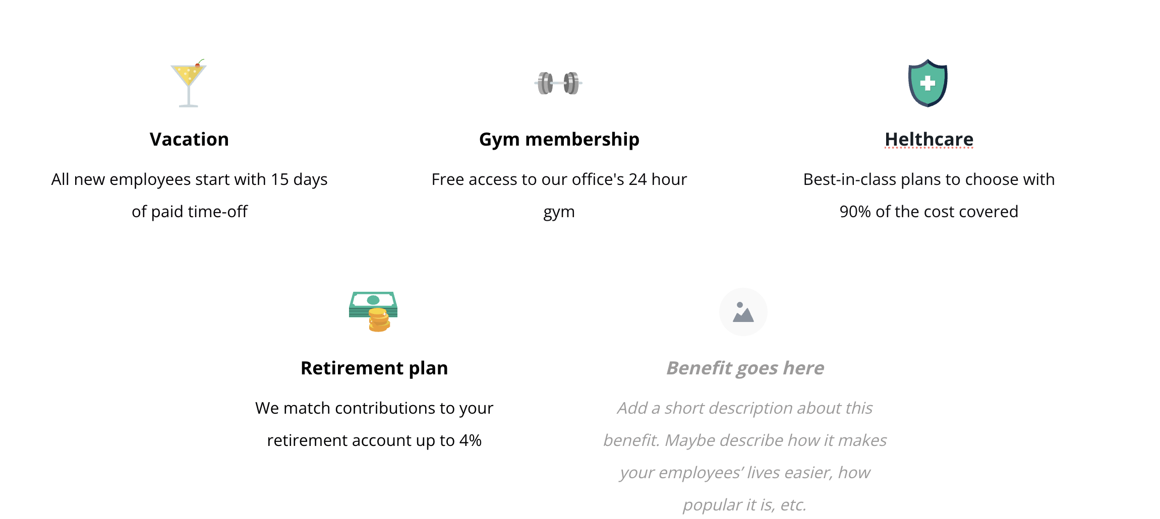 The most successful careers pages have thorough Benefits sections. This is one of the first things that candidates look for. Benefits information can be a big factor in whether or not they apply.