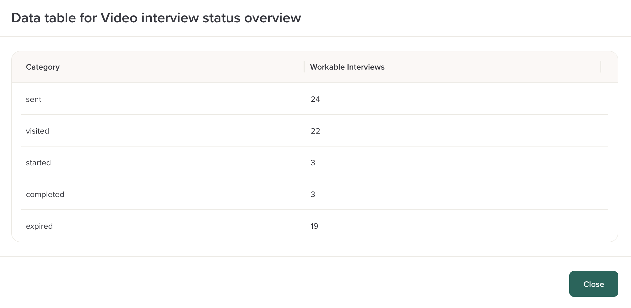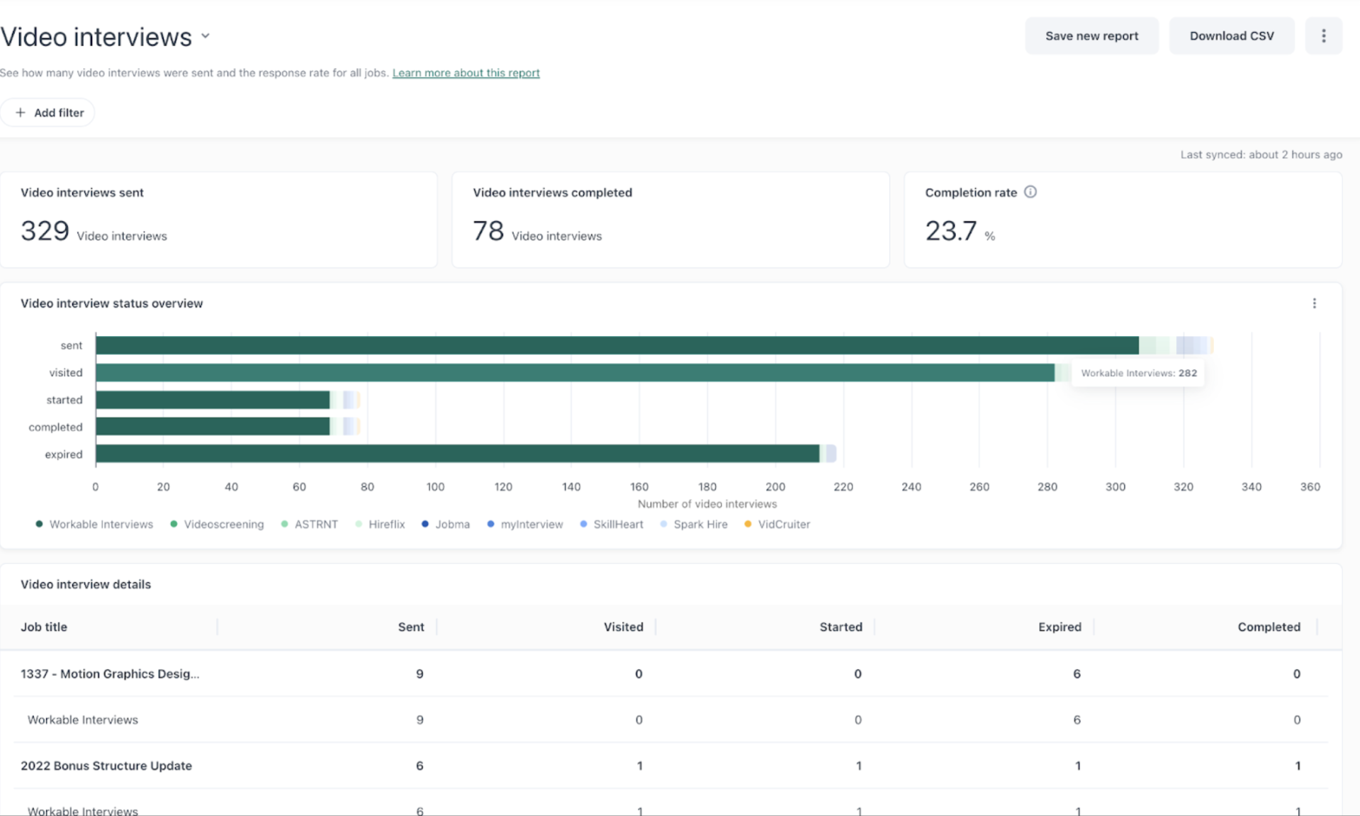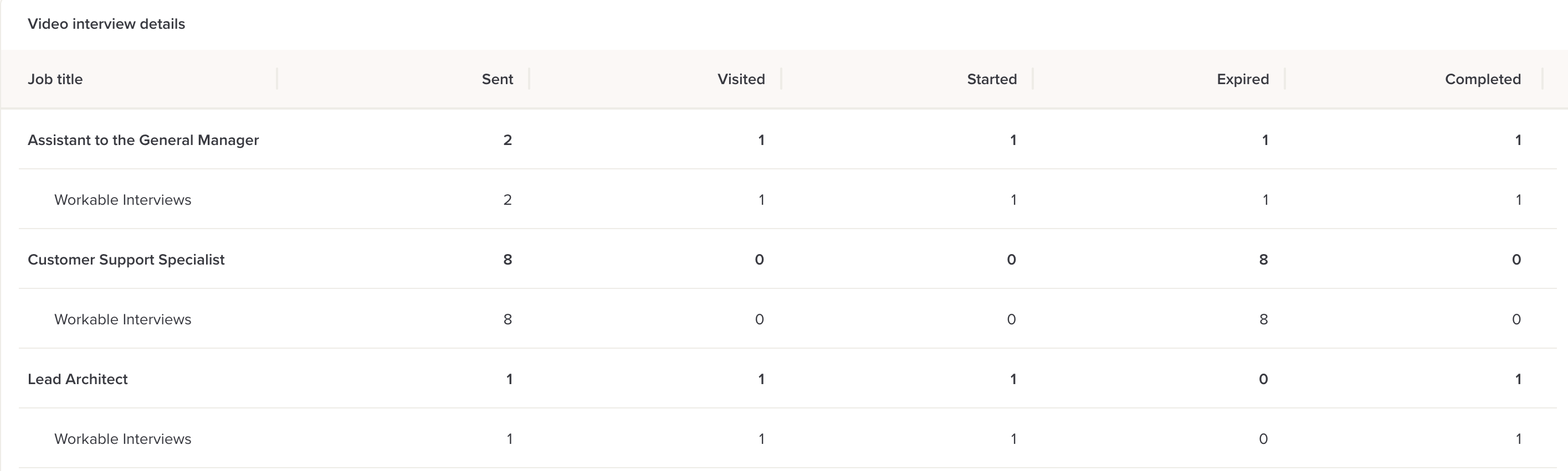 Within this table, you can view the number of video interviews sent per job, along with the type of video interview provider (example: Workable video interviews).