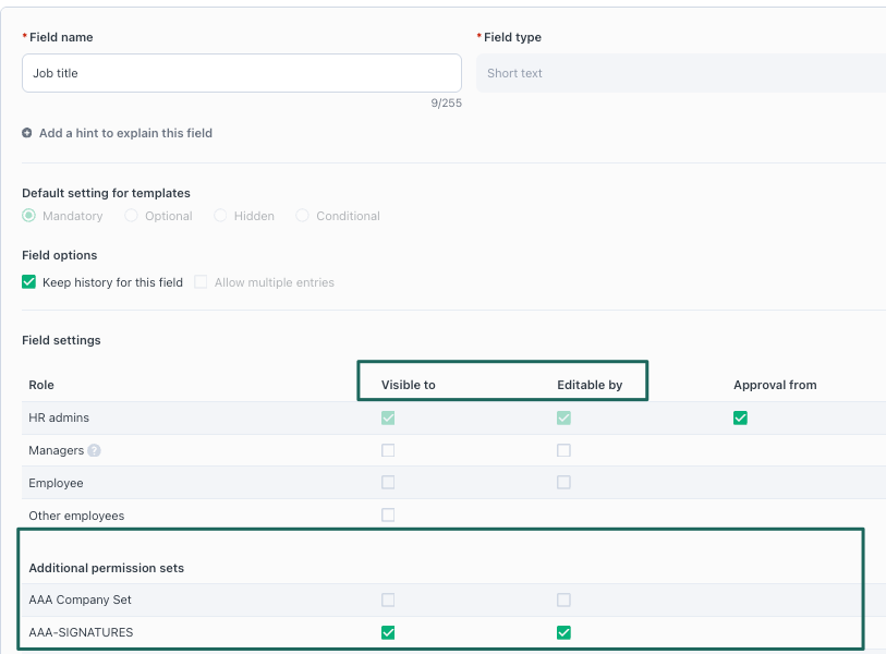 | Add, edit, delete historic profile entries | When this permission is assigned, users who can view or view/edit profile fields, also have the ability to view, add, edit and delete historic fields. This means when they are viewing an employee profile, for the fields they can view they can view existing historic entries, and for the fields they can edit they see options to add historic entry, edit entry, delete entry, and can perform these actions. If no view/edit field permission is assigned, this permission has no effect. |